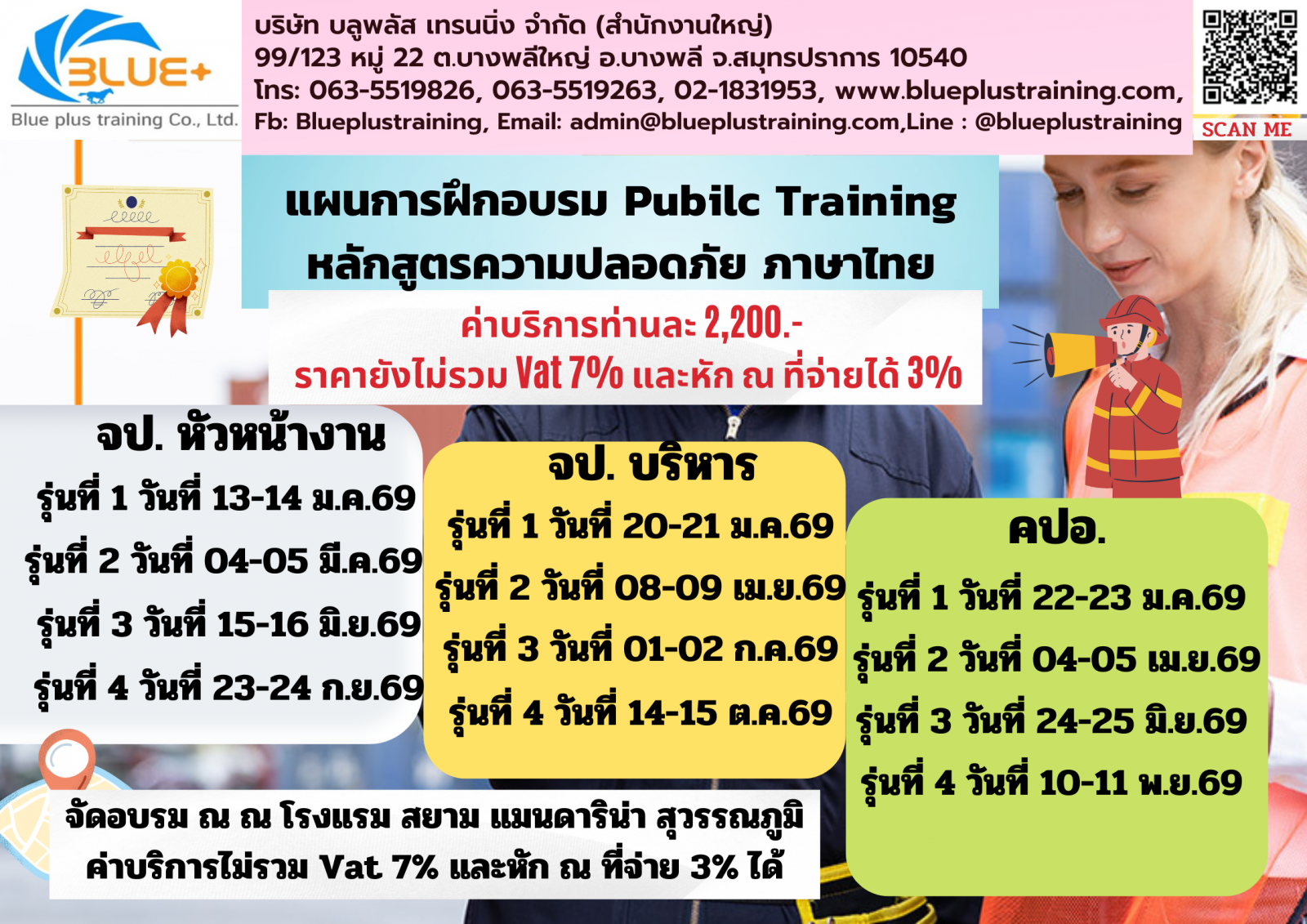 สถาบันฝึกอบรม บลูพลัส เทรนนิ่ง ได้รับใบอนุญาตจากรมสวัสดิการและคุ้มครองแรงงานให้เป็นผู้จัดฝึกอบรมหลักสูตรนี้ และเราใช้ทีมวิทยากรที่ได้รับอนุมัติจากกรมสวัสดิการและคุ้มครองแรงงานเป็นที่เรียบร้อยแล้ว✍✍